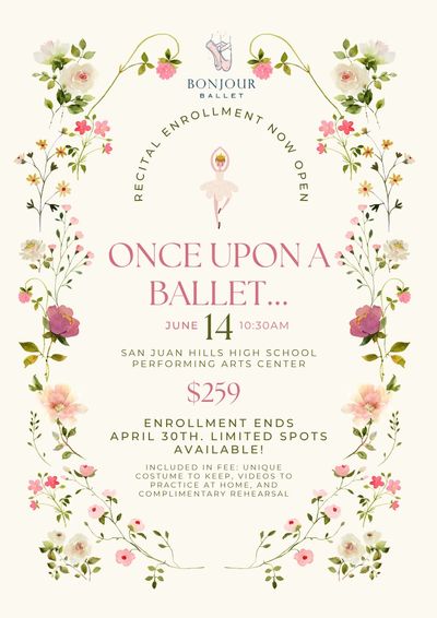 We believe that all children should have the opportunity to perform on a huge stage and be immersed in the experience of sound, light, and the applause of support! Our recitals take place at the amazing San Juan Hills High School Performing Arts Center. Once Upon a Ballet will take place on June 14th at 10:30am. All practices and rehearsal will be held at the studio. Practices will take place during normal class times and the rehearsal will take place a week before the grand performance - stay tuned for the exact time to be announced very soon!